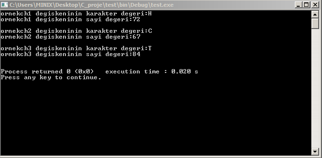printf("ornekch1 degiskeninin sayi degeri:%dnn", ornekch1);
