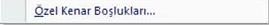 Özel Kenar Boşlukları: Kendi kenar boşluğu ayarlarınızı da belirleyebilirsiniz. Kenar Boşlukları öğesini tıklatın, Özel Kenar Boşlukları Öğesini tıklatın ve ardından Üst, Alt, Sol ve Sağ kutularına, kenar boşlukları için yeni değerleri yazın.Cilt payıda yansıtmalıdaki gibi bir kenarı digerlerinden daha fazla olmasıdır. Cilt payı yeri ise cilt payının sağ veya sol tarafına verilecegini belirler.