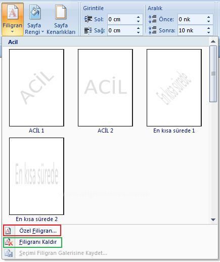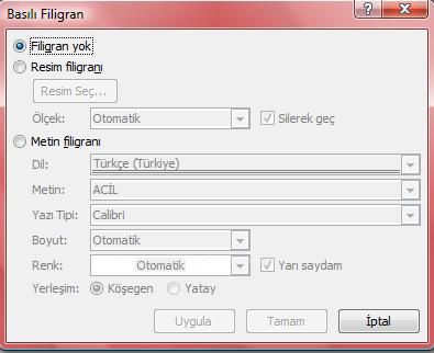 özel filigran sayfasına girildiginde burası açılır.Eger filigran yoksa filigran yok seçilidir.Seçmek istersek buradan tercih edebiliriz.