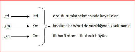 Özel Durumlar penceresinde Word de kayıtlı bazı kısaltmalar bulunur. Kullanıcı da buraya istediği kısaltmaları ekleyebilir. Belgeye burada kayıtlı kısaltmalardan yazarsak kısaltmanın ilk harfi otomatik olarak büyür.