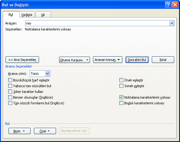 Noktalama karakterini yoksay seçeneğinde ise iki kelime arasında noktalama işareti varsa noktalama işaretini yok sayar ve kelimeleri bulur.