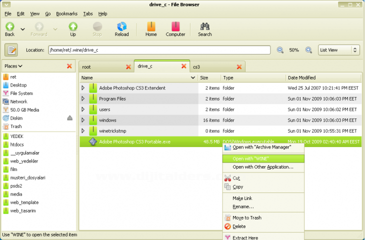 Artık sistemimiz hazır. Wine içerisindeki drive_c klasörü içerisine taşınabilir Adobe Photoshop CS3 Portable.exe dosyamızı atıp sağ tıklayıp WINE ile çalıştır diyerek Photoshop CS3 kullanabiliriz.