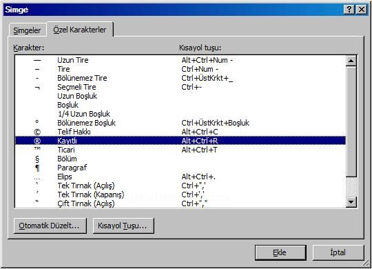 7.Özel karakterler : Klavye ile yazma kolaylığını sağlar.Kısayol özelliğinde de görüldüğü gibi karakter klavye tuşlarıyla da yazılabilir.Yukarıda bulunan otomatik düzelttende konfigrasyonlar değiştirilebilir.