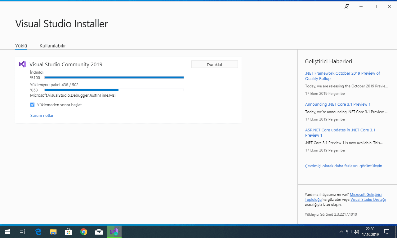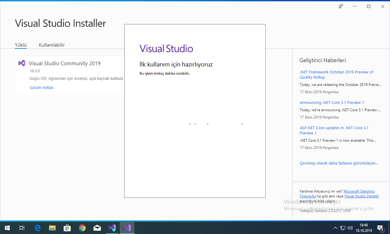 https://visualstudio.microsoft.com/tr/ Açılan sayfa üzerinde bir 3 adet IDE olduğunu göreceksiniz. Bu yazımda Windows kurulumunu anlattığım için "Visual Studio'yu indirin" seçeneği altında "Community 2019" versiyonuna tıklıyoruz.Not: Community 2019'u seçmemizin nedeni ücretsiz olması, diğer seçenekler lisans ücreti talep etmektedir.Eğer tarayıcınız da herhangi bir problem yoksa indirme sayfasında indirme işlemi otomatik gerçekleşecektir. Fakat bir nedenden dolayı indirme işlemi başlamaz ise "yeniden denemek için buraya tıklayın." seçeneğini seçebilirsiniz. İndirilen dosyaya tıklayarak, indirme ve kurulum işlemini başlatıyoruz. Bu işlemin gerçekleşmesi için internet bağlantısının olması gerektiğinin altını çizmeliyim. Açılan kurulum ekranından "Devam" butonuna tıklıyoruz ve kurulum işlemini başlatıyoruz. Artık yapmanız gereken "Visual Studio Installer" kurulumunun tamamlanmasını bekliyoruz.