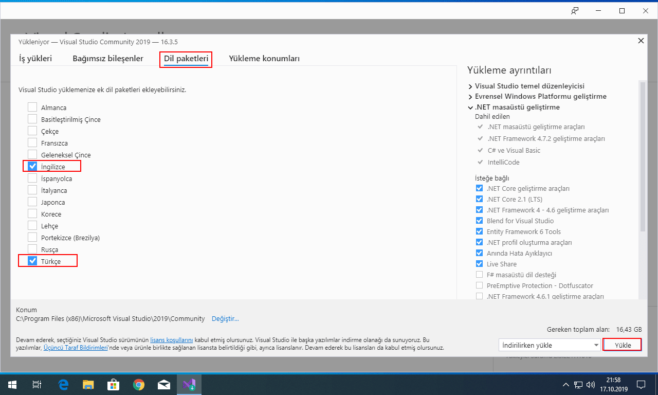 Not: Ekstra bilgi vereyim, programlama ve yazılım dünyası İngilizce olduğundan kendinizi İngilizce dilinin kullanımına alıştırmaya başlamanızı tavsiye ederim. Çünkü programlama sırasında karşınıza çıkacak sorunlar ve çözümler genelde İngilizce olacaktır. Bu nedenle Visual Studio IDE'yi kendi dilinde kullanmanız yerinde olacaktır.Bu aşamada gerekli dosyaların indirilmesini ve kurulmasını bekliyoruz. Bu aşama internet bağlantınızın indirme hızına ve sisteminizin özelliklerine göre biraz uzayabilir. Sabır göstermeniz gerekiyor...