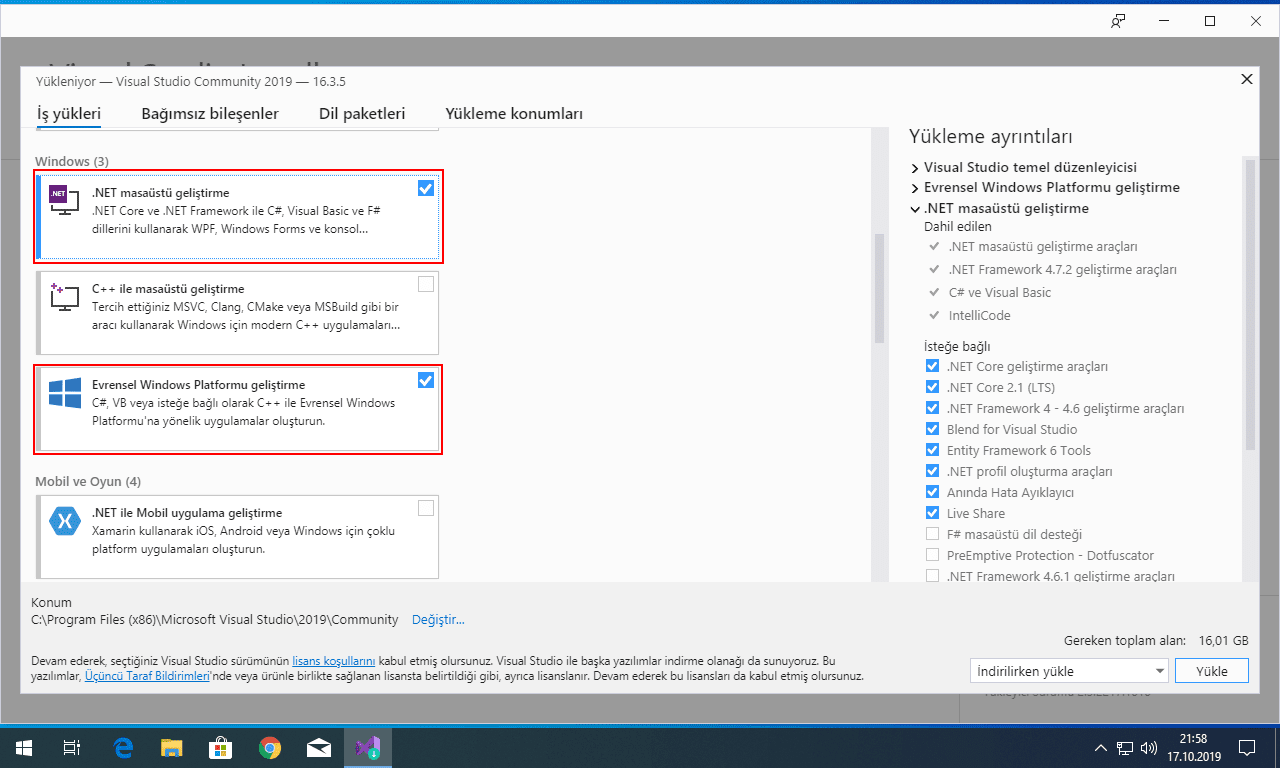 Visual Studio Installer kurulumu tamamlandıktan sonra yukarıda ki pencereye benzer bir kurulum ekranı sizi karşılayacaktır. Bu ekranda Visual Studio ile kullanacağınız programlama dili ve paketleri seçerek visual studio'yu kurabilirsiniz. Lakin biz C# programlama dilini kullanacağımız için bu sayfadan sadece ".Net masaüstü geliştirme" ve "Evrensel Windows Platformu geliştirme" seçeneklerini seçmemiz başlangıç için kafidir.
