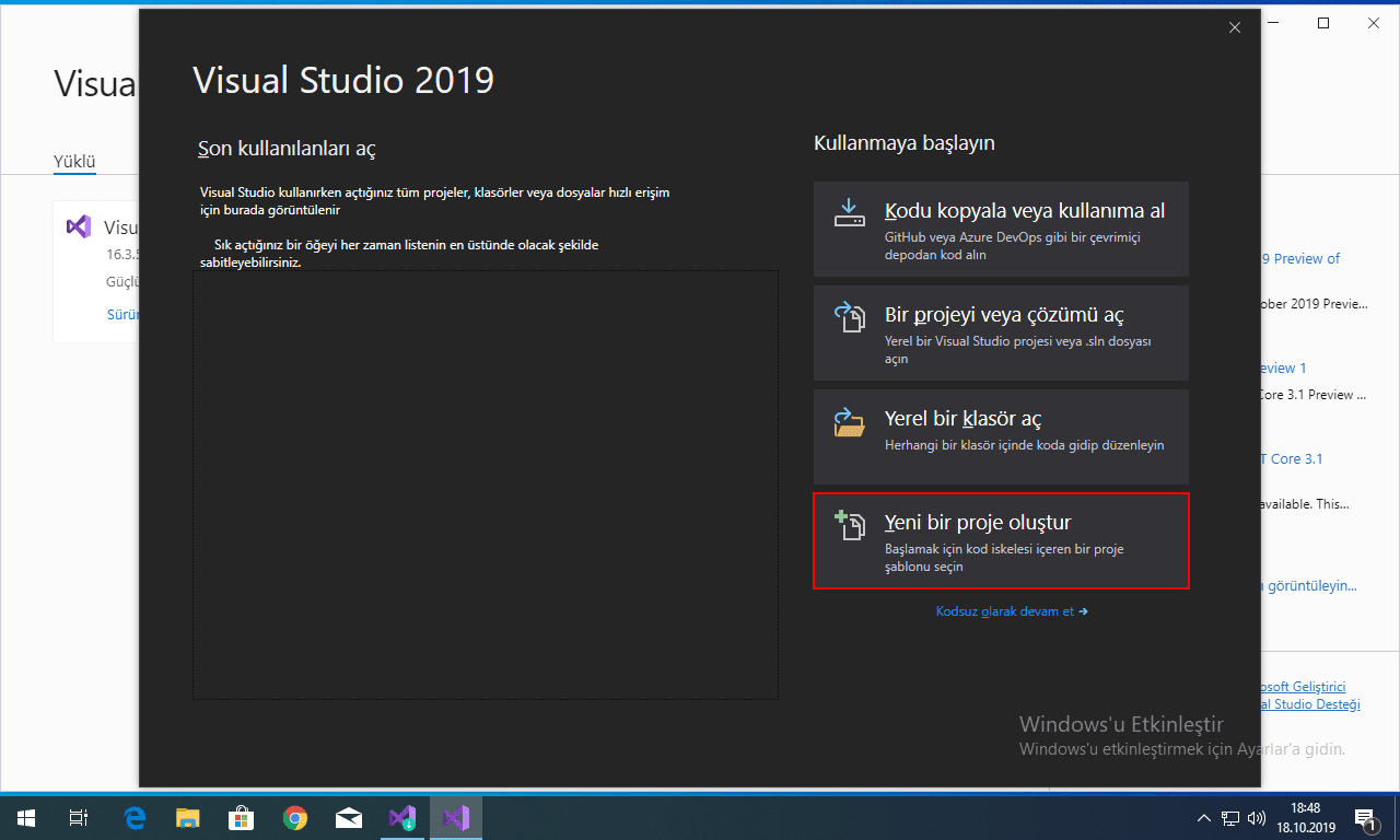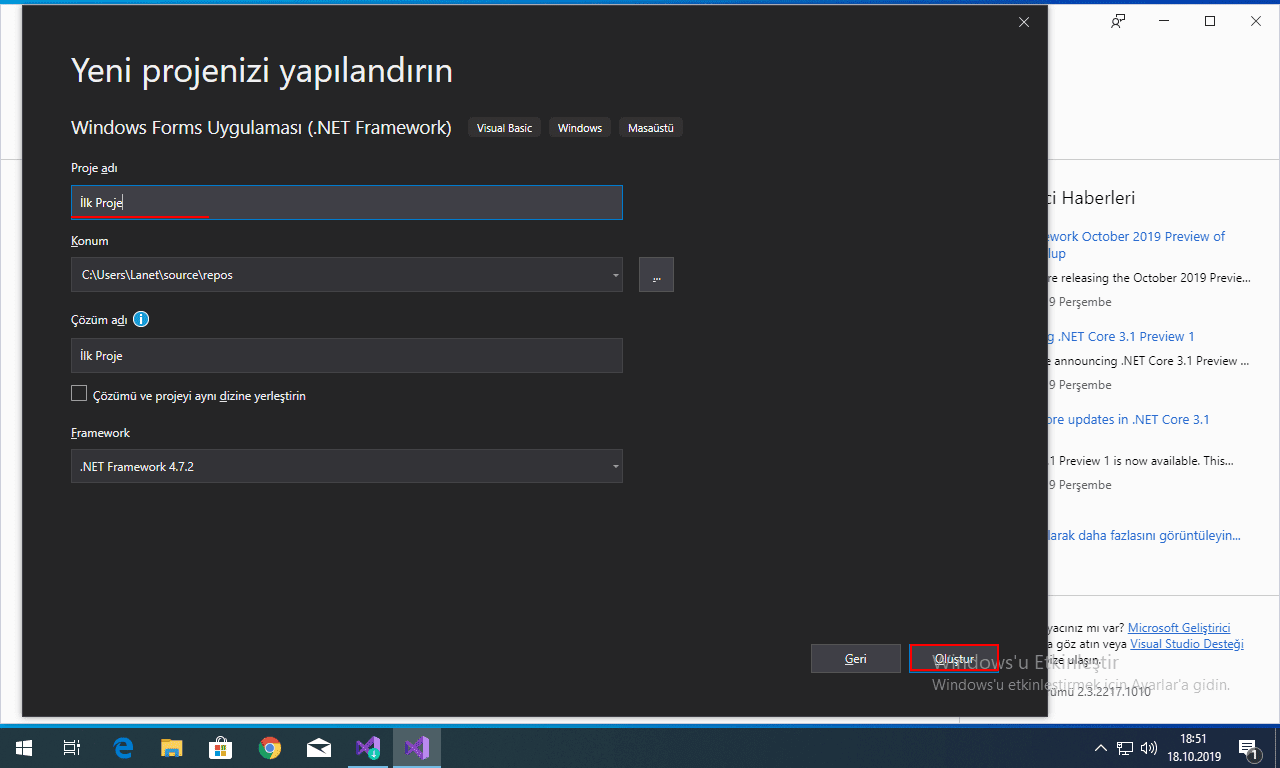 Kurulum tamamlandıktan sonra karşınıza Visual Studio karşılama penceresi gelecektir. Eğer Microsoft hesabınız varsa, hesabınız ile giriş yapabilirsiniz yada "Şimdi değil, belki daha sonra" seçeneğini seçerek devam edebilirsiniz. Karşınıza gelen kullanıcı tercihlerini (tema) seçtikten sonra Visual Studio ayarlarının gerçekleştirilmesini bekliyoruz. Ardından Visual Studio'nun kurulumu tam anlamıyla tamamlanmış oluyor. Görüldüğü üzere karşımıza IDE'nin karşılama ekranı gelecektir. Bundan sonra ilk projemizi oluşturmak için "Yeni bir proje oluştur" seçeneğini seçiyoruz. Gelen seçenekler arasından "Windows Forms Uygulaması (.Net Framework)" seçeneğini örnek için tercih seçiyorum. Eğer konsol uygulaması geliştirecekseniz "Console App (.Net Framework)" seçeneğini de seçebilirsiniz. Bu seçeneklerin seçimi ihtiyacınıza göre değişmektedir. Zamanla bunların seçimini siz kendiniz karar verebilirsiniz. Bu aşamada artık oluşturacağımız projeye bir isim vermemiz gerekiyor. Dilediğiniz ismi verebilirsiniz. İsimlendirmeyi yaptı iseniz "Oluştur" butonuna basarak, projemizin oluşturulmasını bekliyoruz.Gördüğünüz üzere proje tercihimize göre projemiz oluşturulmuş oldu. Bundan sonra projemizin türüne göre kendi projelerinizi geliştirebilirsiniz. Yazımın bundan sonra ki kısmı Visual Studio'yu İngilizce kullanmak isteyenleri ilgilendiriyor.