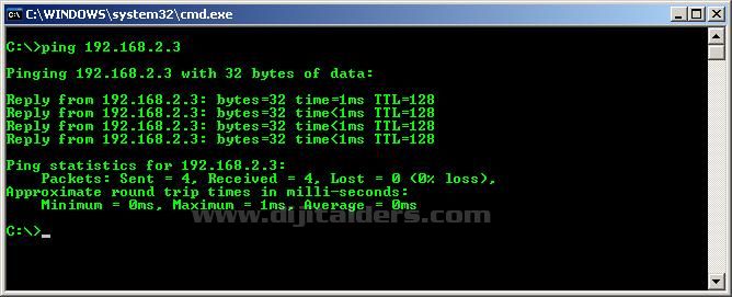Şimdi aşağıdaki pencereye dikkat ederseniz ping “www.dijitalders.com “ yazdık ve bize o adresin gerçekte hangi IP adresi olduğunu bize yazdı.
