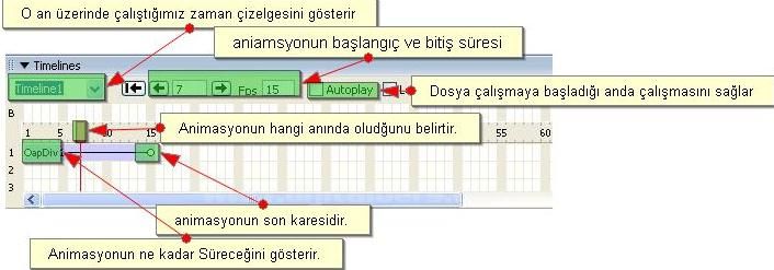 Timeline: Belirli Zaman aralıklarında Dosya üzerinde bulunan nesnenlerin hareket etmesi için kullanılan Flash'daki ile aynı özellikleri taşıyan bir dreamweaver özelliğidir.